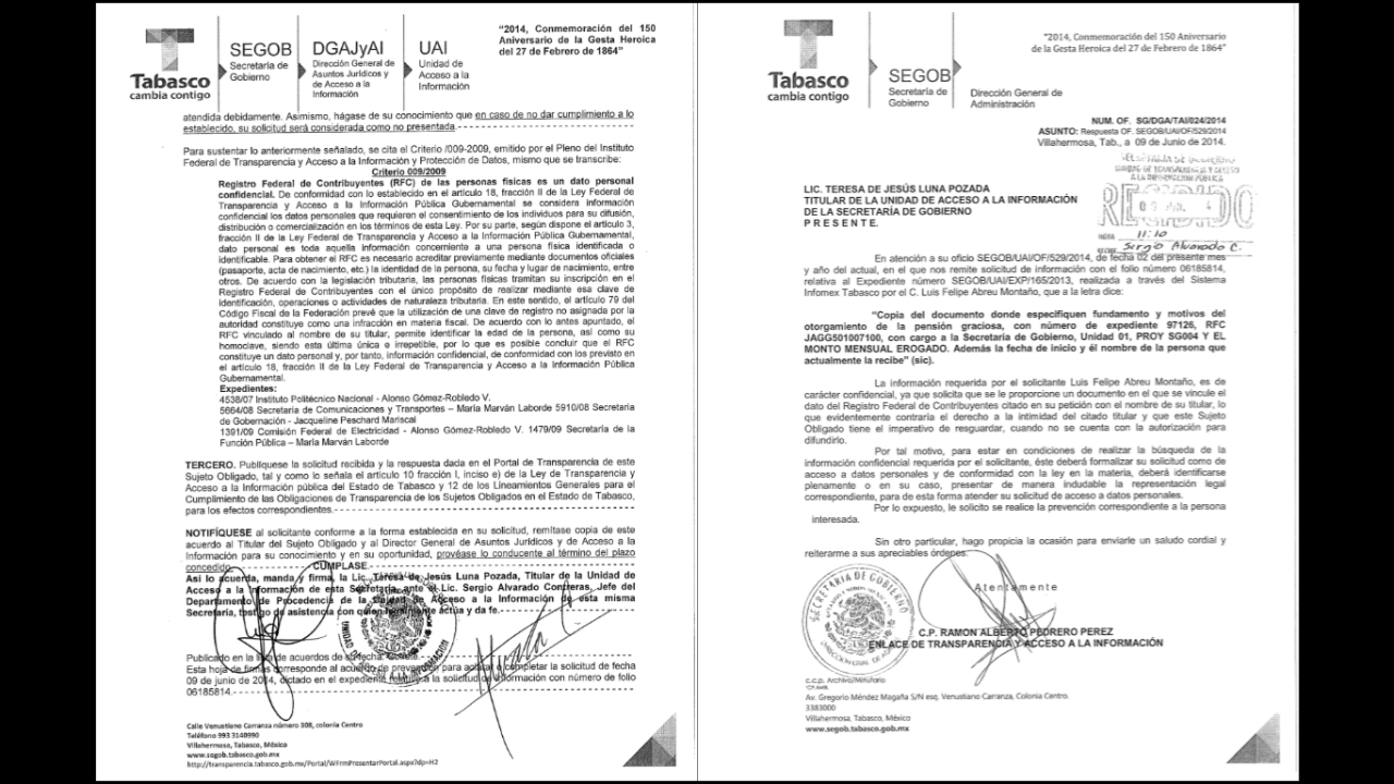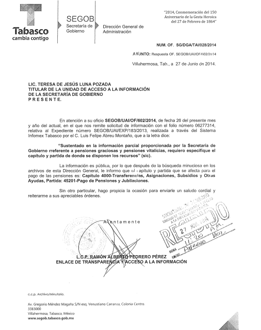 En Tabasco, vía transparencia, obtuvimos la acreditación del pago de pensiones graciosas, desde la Secretaría de Gobierno. (ver anexo)