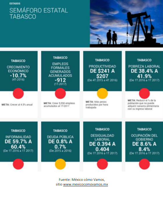 Económicamente los tabasqueños están en una de sus peores crisis o quizá la peor de su historia contemporánea, la desocupación es de 6.8 a 8 a finales de 2016 y principios de 2017, en el cuarto trimestre de 2016 el crecimiento fue de -10.7[20].El sector primario está desarticulado y las participaciones petroleras fueron reformuladas beneficiando al Estado de México, y la reacción del gobierno de ANJ fue tibia, la inundación del 2009, la corrupción de Granier, la complicidad o ineficacia del ANJ y la debacle petrolera han hecho inalcanzable la prosperidad tabasqueña.