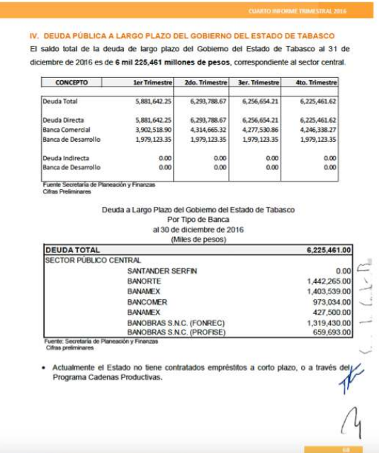 La Secretaría de Planeación y Finanzas, en el cuarto informe trimestral 2016, reconoce la existencia de una deuda pública por seis mil doscientos veinticinco millones de pesos.