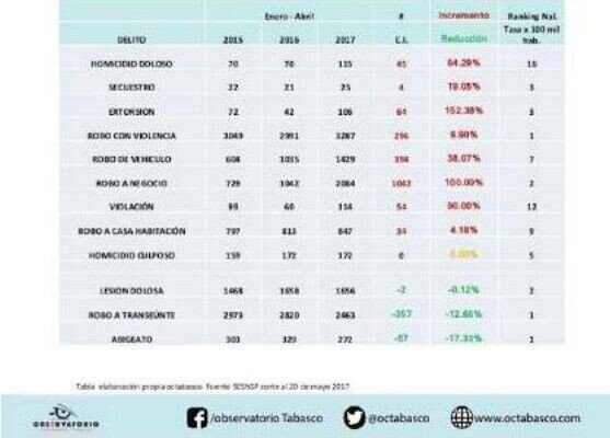 En mayo de 2017, Observatorio Tabasco publicó vía @octabasco (Twitter): ocho de doce delitos presentan incremento en el cuatrimestre de 2017 en relación a 2016, y once están arriba de la media nacional, la extorsión reporta un incremento de 152.38%acumulado enero abril 2017 comparado con el mismo periodo de 2016.