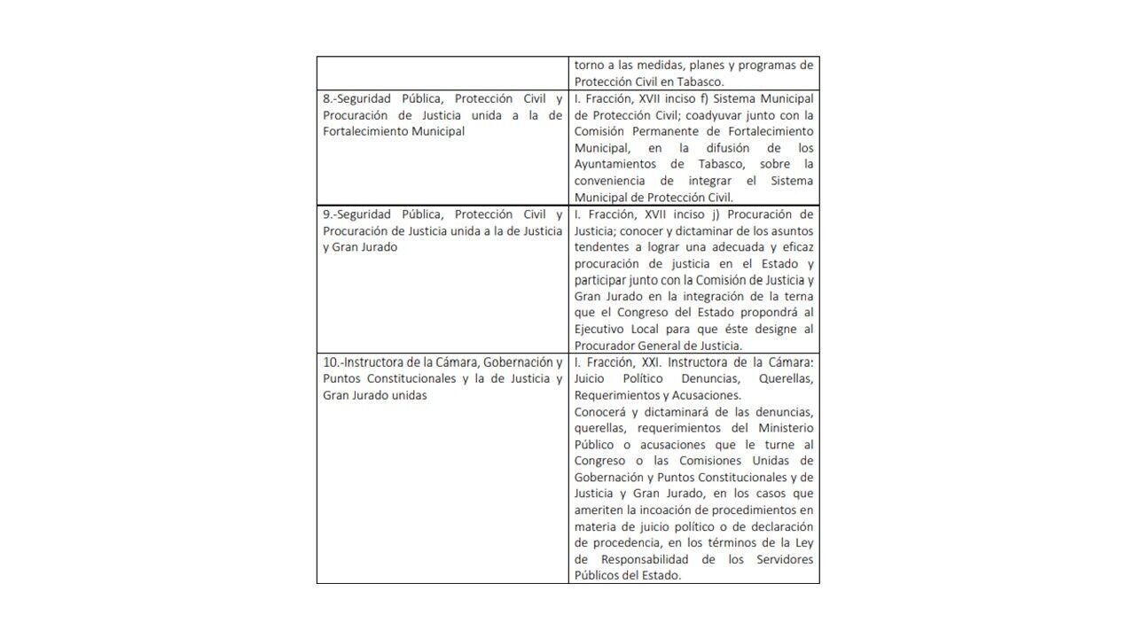 [10] Comisión de Gobernación y Puntos Constitucionales; Comisión de Fortalecimiento Municipal, Atención a grupos Vulnerables, personas con características especiales y adultos mayores, y Comisión especial de Recursos Hidráulicos.